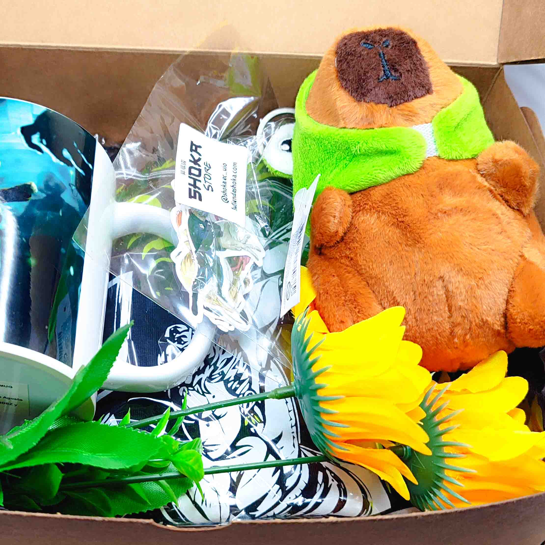 Cuando alcanzas el nivel Kage, descubres que incluso el poder necesita ternura. Dentro encontrarás un peluche capibara adorable, una botella de vino,  una camiseta sorpresa(3 grandes Naruto, One Piece, Bleach), una taza otaku y 10 stickers únicos que derriten corazones.